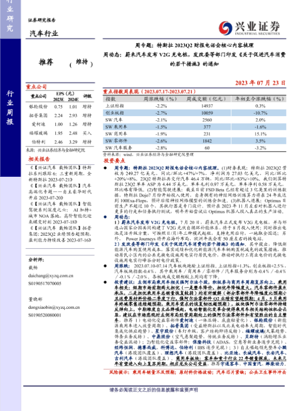 【兴业证券】【20230723】周专题:特斯拉 2023Q2财报电话会核心内容梳理 周动态:蔚来汽车发布 V2G充电桩,发改委等部门印发《关于促进汽车消费的若干措施》的通知-19页 行业研究