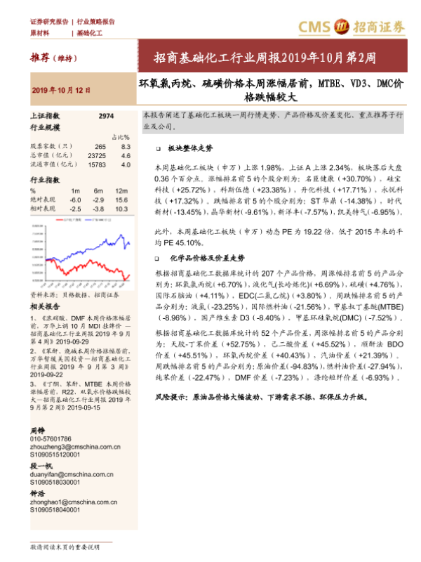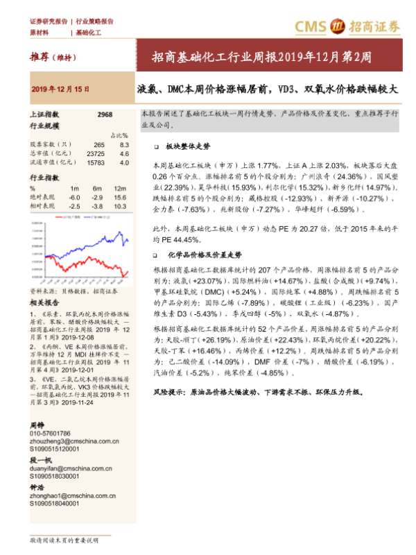 【海通证券】【20191027】招商基础化工行业周报2019年10月第4周:液氯、双氧水本周价格涨幅居前,VD3、K3价格跌幅较大-17页 行业研究