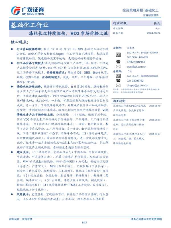 【广发证券】【20240624】20240624-广发证券-基础化工行业:涤纶长丝持续挺价,VD3市场价格上涨-17页 行业研究