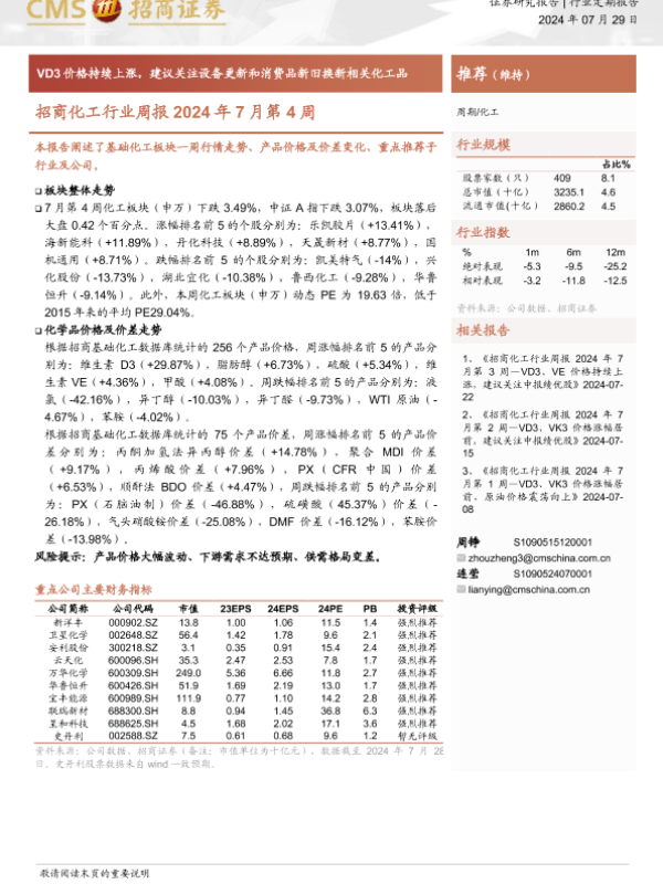 【海通证券】【20240729】2024年7月第4周化工行业周报:VD3价格持续上涨,建议关注设备更新和消费品新旧换新相关化工品-25页 行业研究