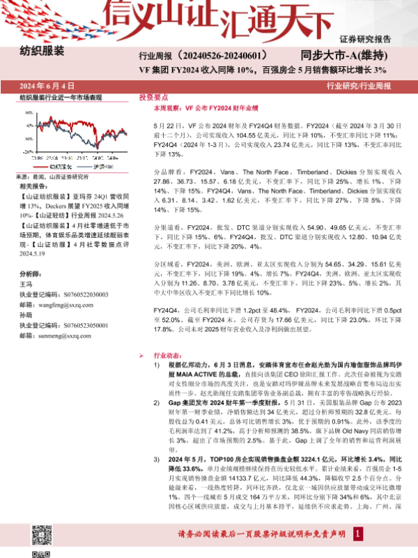 【山西证券】【20240604】纺织服装行业周报:VF集团FY2024收入同降10%,百强房企5月销售额环比增长3%-20页 行业研究