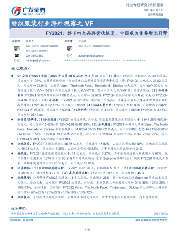 【广发证券】【20210608】纺织服装行业海外观察之 VF:FY2021:旗下四大品牌营收恢复,中国成为重要增长引擎-8页 行业研究