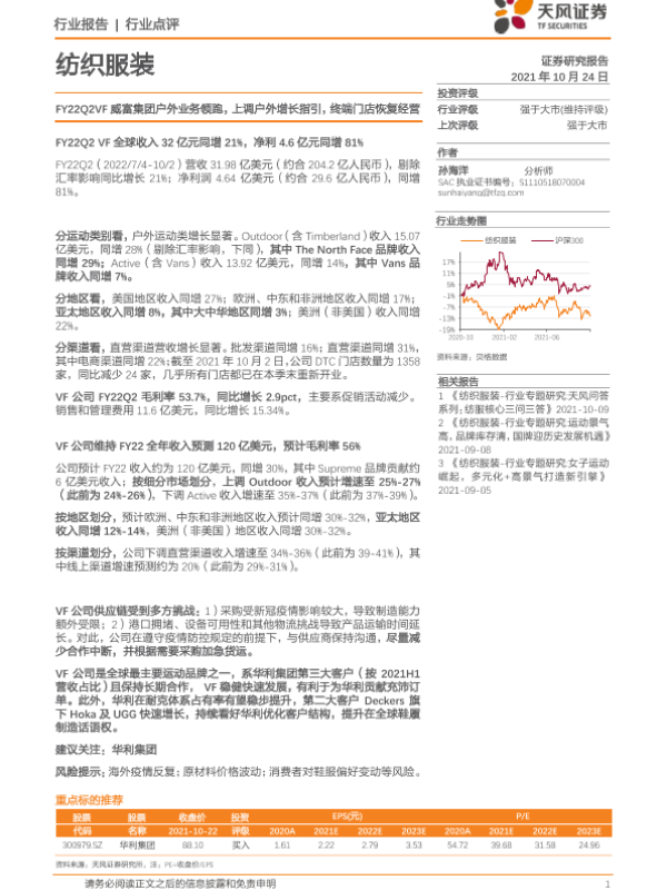 【天风证券】【20211024】纺织服装行业点评:FY22Q2VF威富集团户外业务领跑,上调户外增长指引,终端门店恢复经营-2页 行业研究