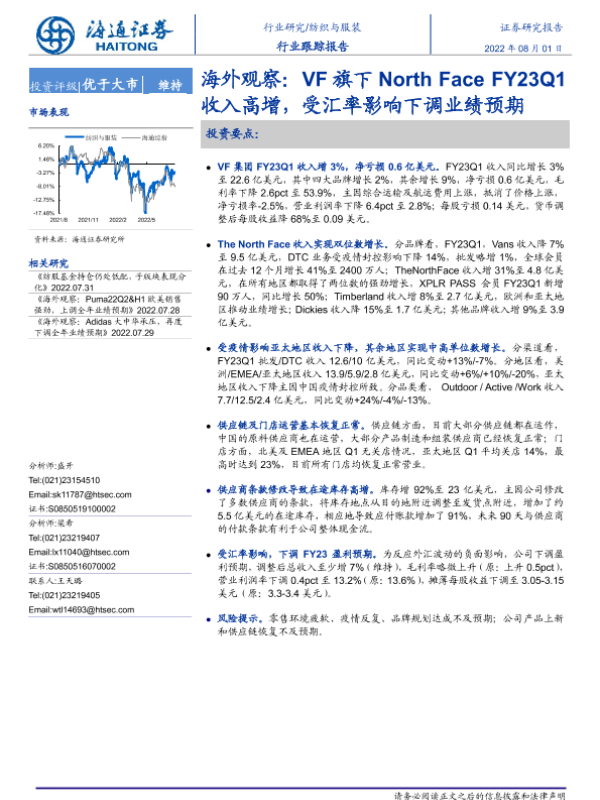 【海通证券】【20220801】纺织与服装海外观察:VF旗下North Face FY23Q1收入高增,受汇率影响下调业绩预期-2页 行业研究