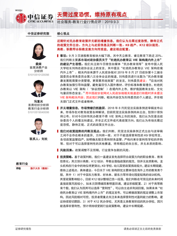 【中信证券】【20190903】20190903-中信证券-社会服务-教育行业行情点评:无需过度恐慌,维持原有观点-3页 行业研究