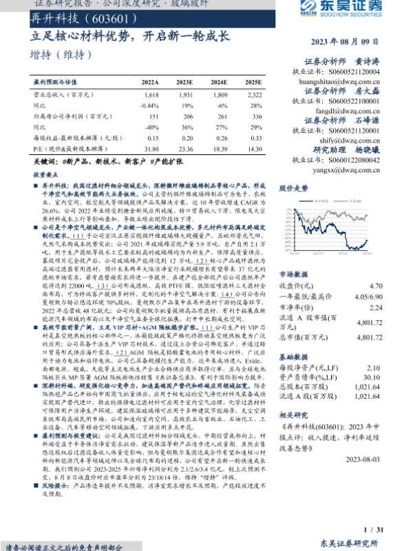 【东吴证券】【20230809】再升科技-603601.SH-立足核心材料优势,开启新一轮成长-31页 行业研究