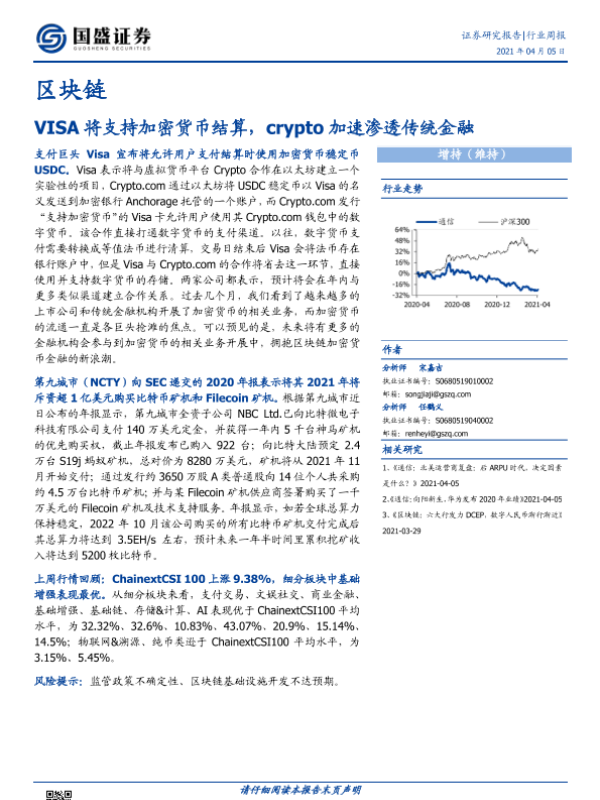 【国盛证券】【20210405】20210405-国盛证券-区块链行业周报:VISA将支持加密货币结算,crypto加速渗透传统金融-9页 行业研究