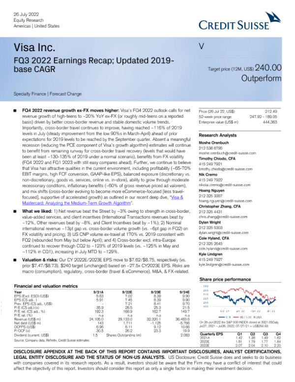 【Credit Suisse】【20220726】CS-Visa Inc. FQ3 2022 Earnings Recap; Updated 2019-base CAGR-10页 行业研究