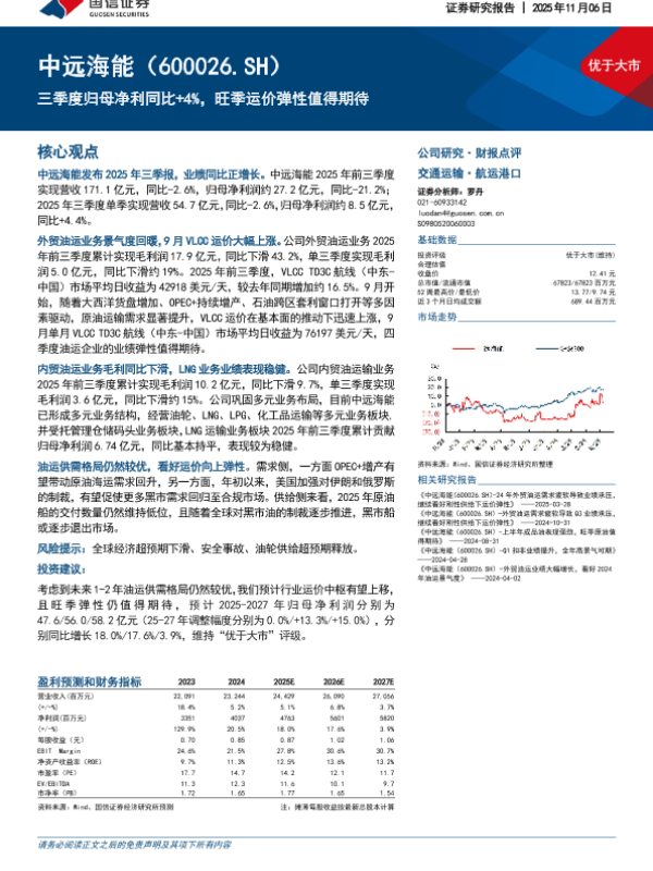 【国信证券】【202511】2025年11月06日|优于大市 中远海能(600026.SH)三季度归母净利同比+4%,旺季运价弹性值得期待-6页 证券期货研究报告