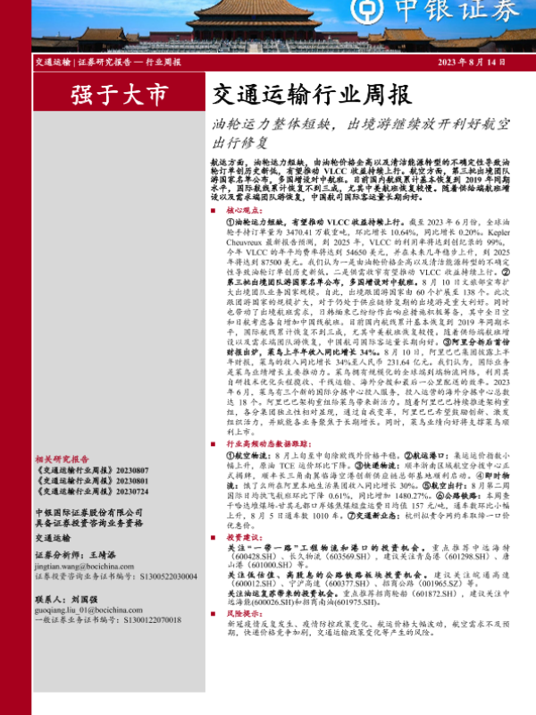 【中银证券】【20230814】交通运输行业周报:油轮运力整体短缺,出境游继续放开利好航空出行修复-31页 行业研究