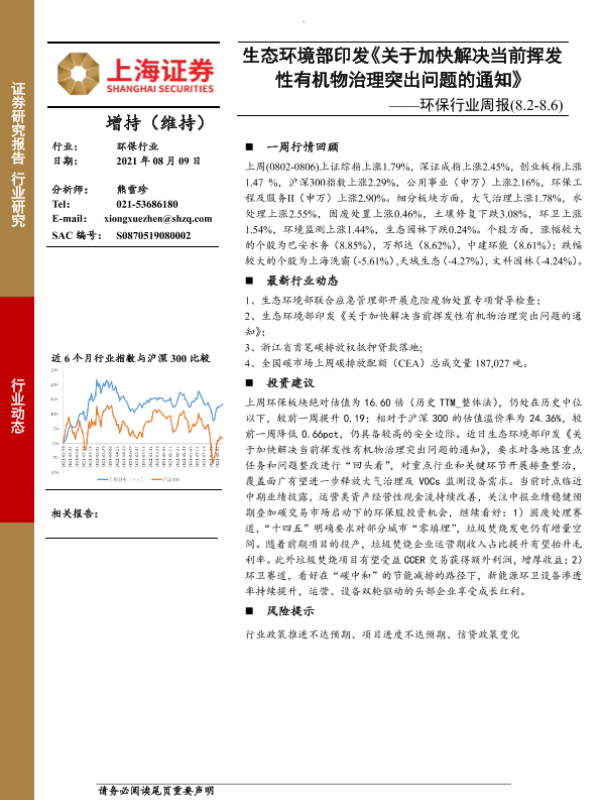 【上海证券】【20210809】环保行业周报:生态环境部印发《关于加快解决当前挥发性有机物治理突出问题的通知》-9页 行业研究