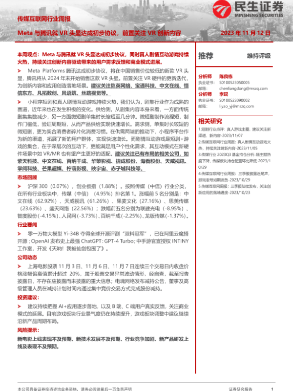 【国金证券】【20231112】传媒互联网产业行业研究:腾讯或将在中国独家销售Meta VR头显,OpenAI开发者大会召开-22页 行业研究