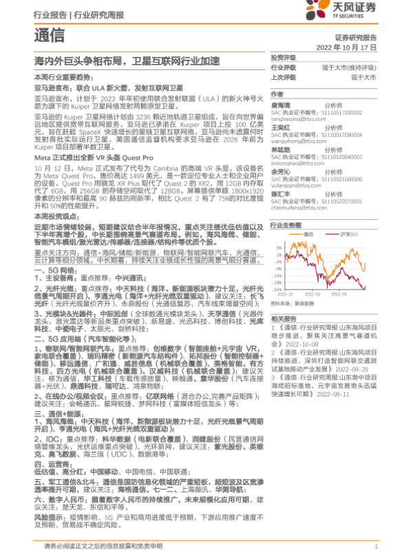 【天风证券】【20221017】通信行业研究周报:海内外巨头争相布局,卫星互联网行业加速-11页 行业研究