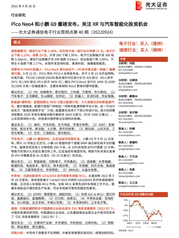 【光大证券】【20220924】20220924-光大证券-通信电子行业周观点第40期:Pico Neo4和小鹏G9重磅发布,关注XR与汽车智能化投资机会-17页 行业研究