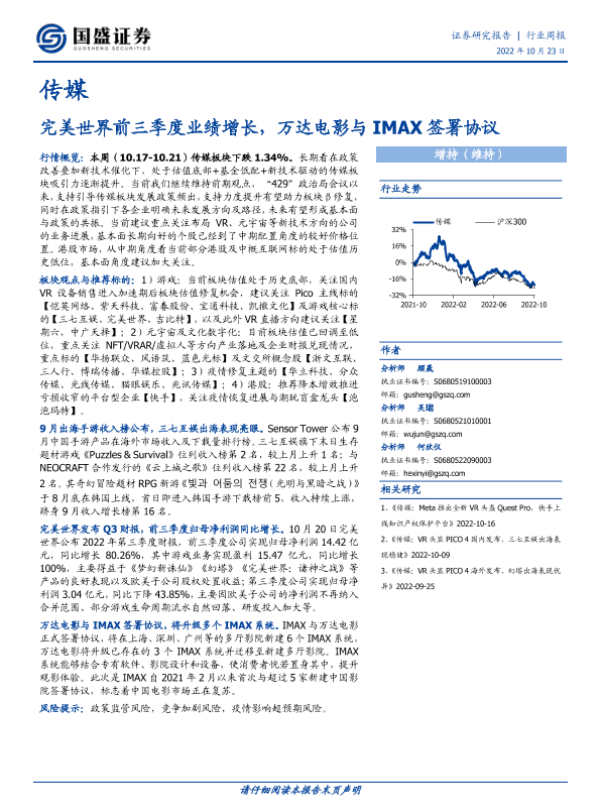 【国盛证券】【20221023】传媒行业周报:完美世界前三季度业绩增长,万达电影与IMAX签署协议-10页 行业研究