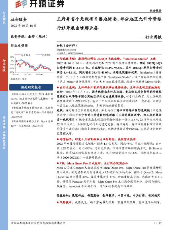 【开源证券】【20221016】社会服务行业周报:王府井首个免税项目落地海南,部分地区允许外资旅行社开展出境游业务-17页 行业研究