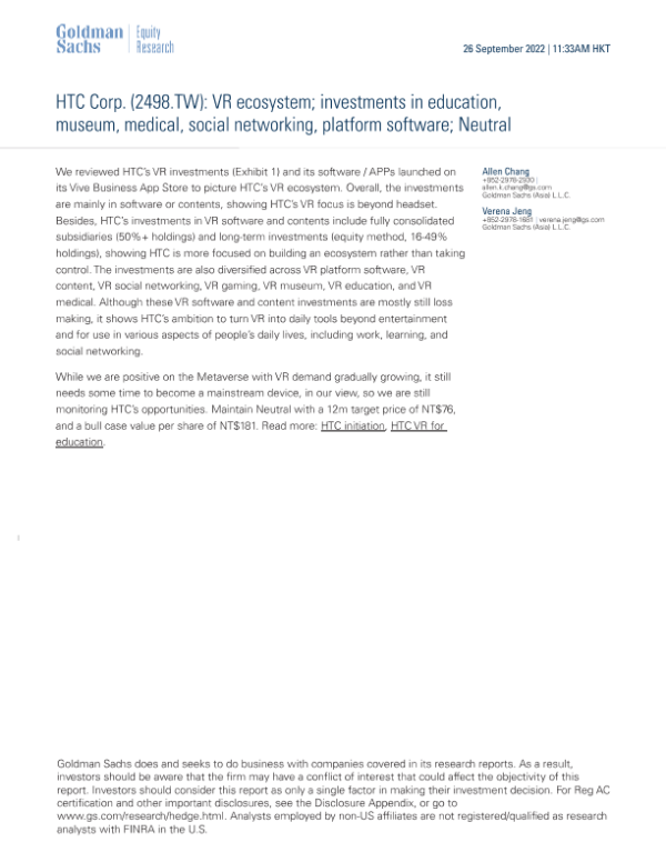 【Goldman Sachs】【20220926】HTC Corp. VR ecosystem; investments in education, museum, medical, social networking, platform software; Neutral-10页 行业研究