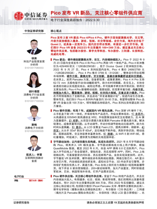 【中信证券】【20220930】电子行业深度跟踪报告:Pico发布VR新品,关注核心零组件供应商-20页 行业研究