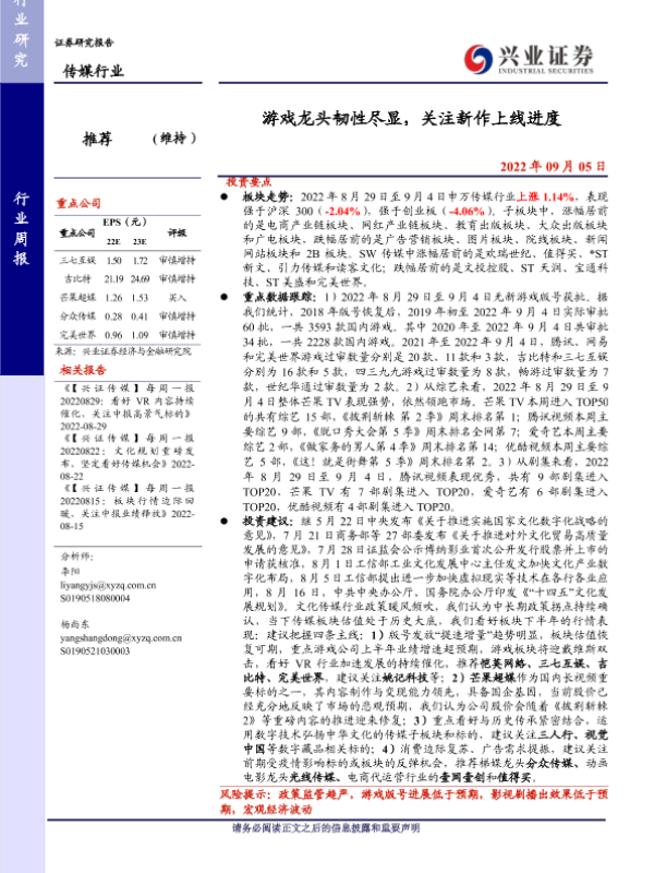 【兴业证券】【20220905】游戏龙头韧性尽显,关注新作上线进度-22页 行业研究