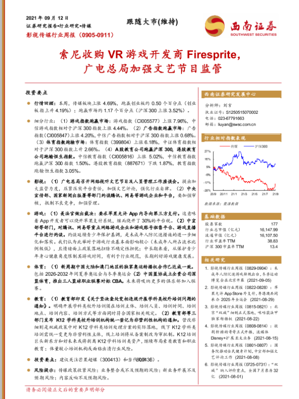 【西南证券】【20210912】影视传媒行业周报:索尼收购VR游戏开发商Firesprite,广电总局加强文艺节目监管-18页 行业研究