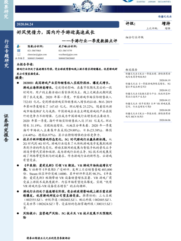 【国泰君安证券】【20200424】手游行业一季度数据点评:好风凭借力,国内外手游迎高速成长-17页 行业研究