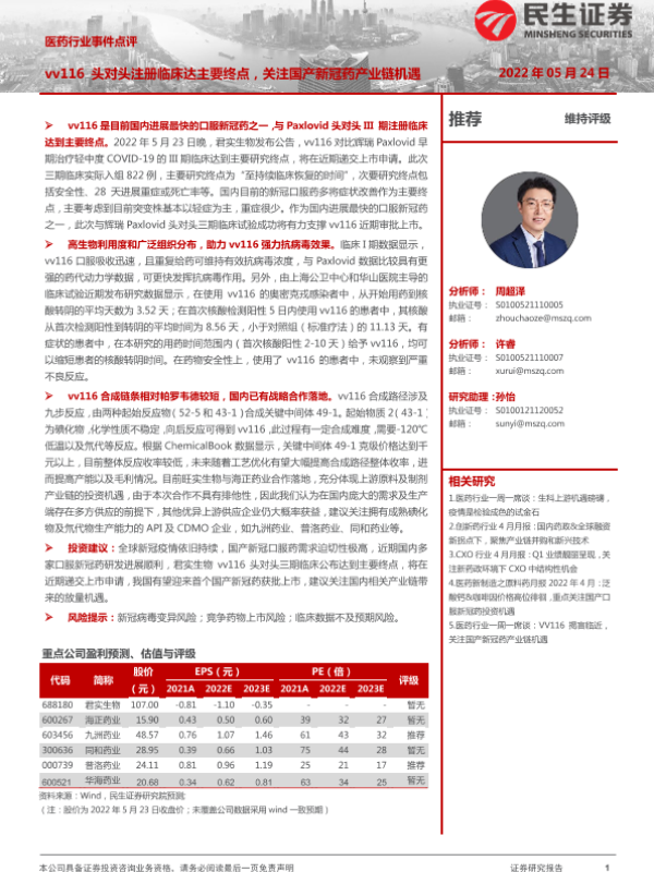 【民生证券】【20220524】医药行业事件点评:vv116头对头注册临床达主要终点,关注国产新冠药产业链机遇-2页 行业研究