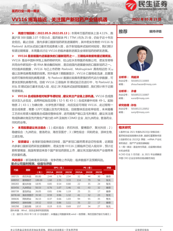 【民生证券】【20220515】医药行业一周一席谈:VV116揭盲临近,关注国产新冠药产业链机遇-17页 行业研究