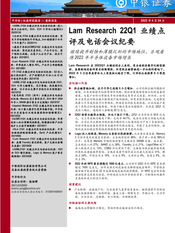 【中银证券】【20220424】Lam Research 22Q1业绩点评及电话会议纪要:继续提升刻蚀和薄膜沉积的市场地位,乐观看待2022年半导体设备市场增长-13页 行业研究