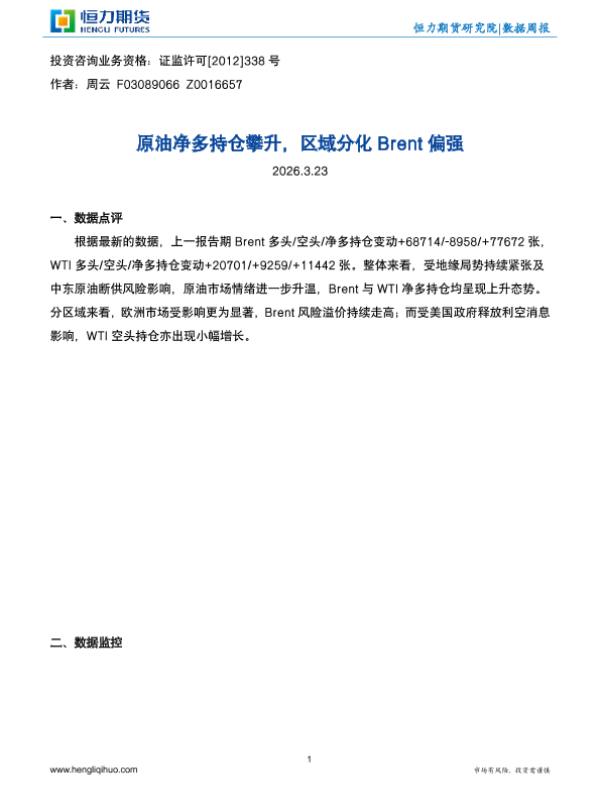 【恒力期货】【202603】原油净多持仓攀升_区域分化Brent偏强-4页 证券期货研究报告