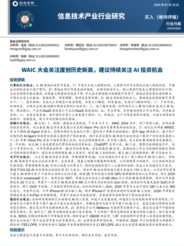【国金证券】【20240710】信息技术产业行业研究月报:WAIC大会关注度创历史新高,建议持续关注AI投资机会-17页 行业研究