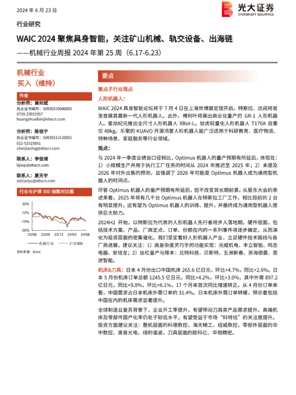 【光大证券】【20240623】2024年第25周机械行业周报:WAIC 2024聚焦具身智能,关注矿山机械、轨交设备、出海链-11页 行业研究