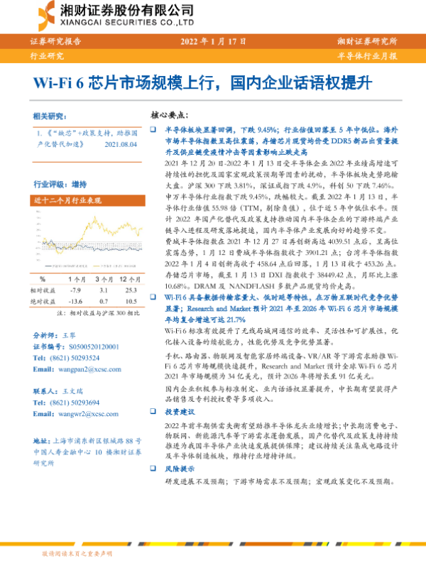 【湘财证券】【20220117】半导体行业月报:Wi-Fi6芯片市场规模上行,国内企业话语权提升-11页 行业研究