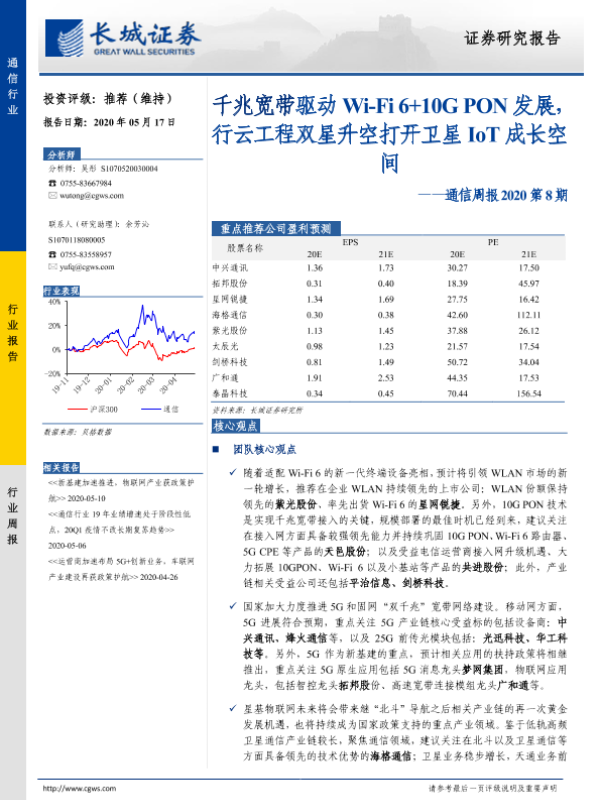 【长城证券】【20200517】通信周报2020第8期:千兆宽带驱动Wi-Fi6+10G PON发展,行云工程双星升空打开卫星IoT成长空间-21页 行业研究