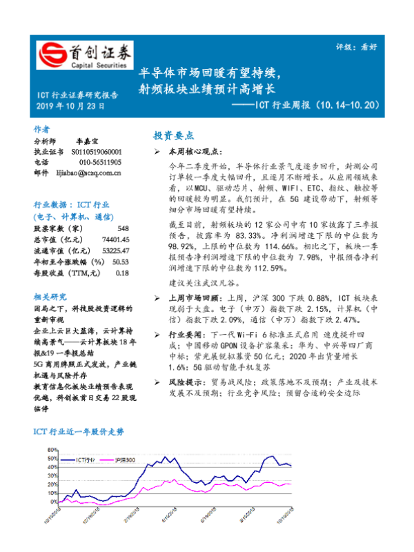 【首创证券】【20191023】ICT行业周报:半导体市场回暖有望持续,射频板块业绩预计高增长-13页 行业研究
