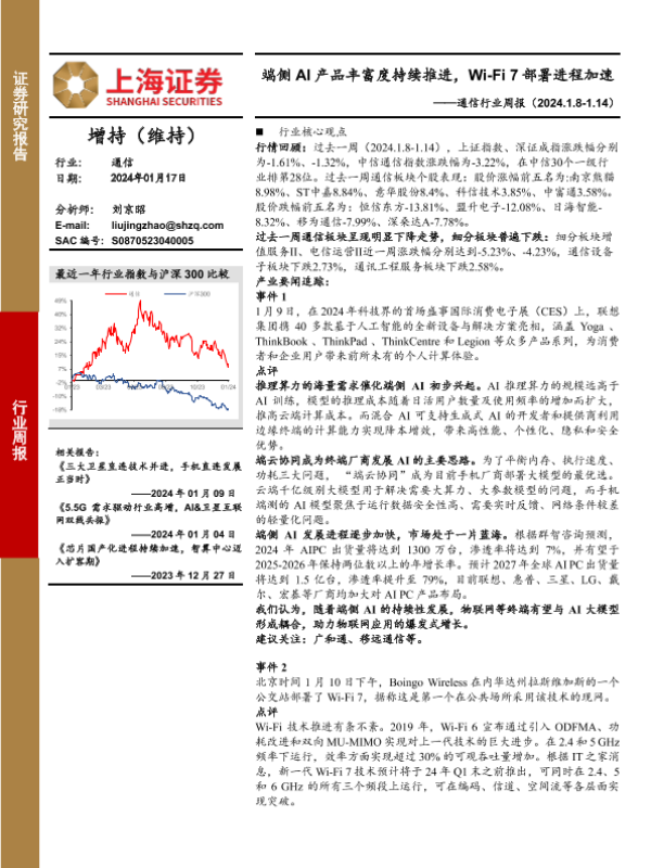 【上海证券】【20240117】20240117-上海证券-通信行业周报:端侧AI产品丰富度持续推进,Wi-Fi 7部署进程加速-11页 行业研究