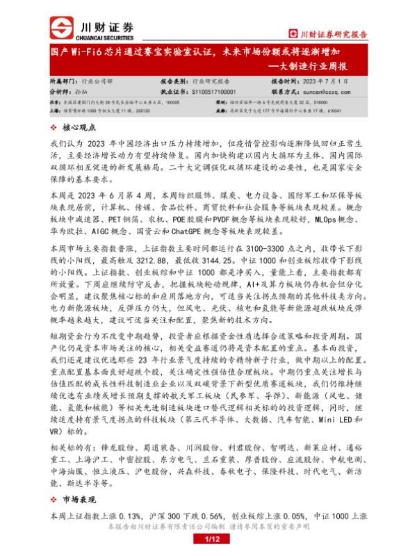 【川财证券】【20230701】大制造行业周报:国产Wi-Fi6芯片通过赛宝实验室认证,未来市场份额或将逐渐增加-12页 行业研究