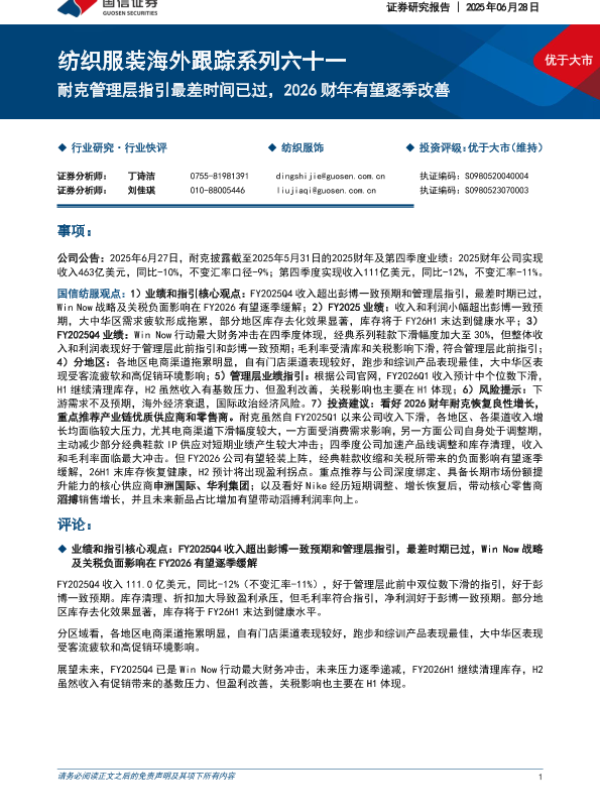 【国信证券】【20250628】纺织服装行业海外跟踪系列六十一:耐克管理层指引最差时间已过,2026财年有望逐季改善-11页 行业研究