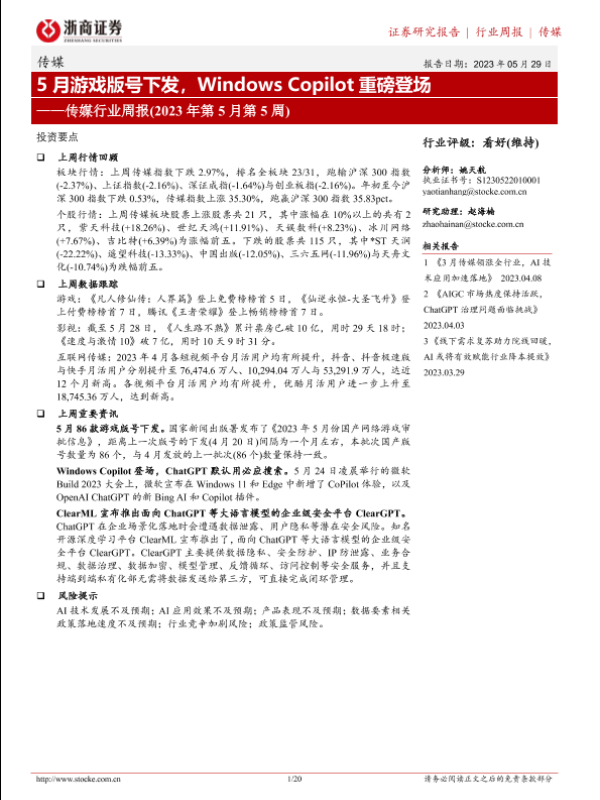 【浙商证券】【20230529】传媒行业周报(2023年第5月第5周):5月游戏版号下发,Windows Copilot重磅登场-20页 行业研究