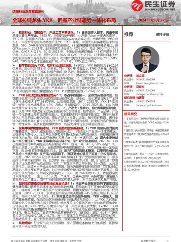 【民生证券】【20240927】纺服行业深度复盘系列:全球拉链龙头YKK,把握产业链趋势一体化布局-35页 行业研究