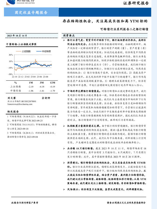 【财信证券】【20231014】可转债行业系列报告二之银行转债:存在结构性机会,关注高成长性和高YTM标的-25页 行业研究