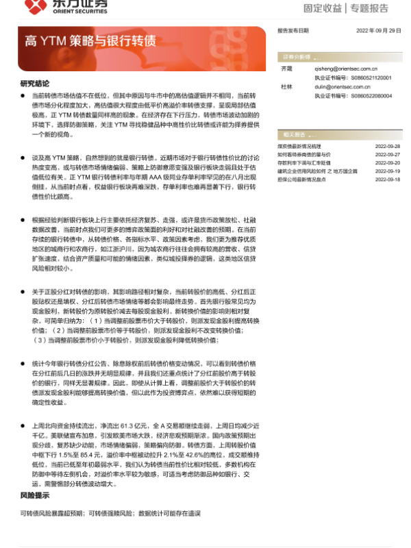 【东方证券】【20220929】高YTM策略与银行转债-15页 行业研究