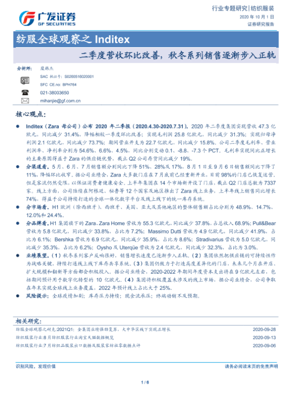 【广发证券】【20201001】纺服全球观察之Inditex:二季度营收环比改善,秋冬系列销售逐渐步入正轨-6页 行业研究