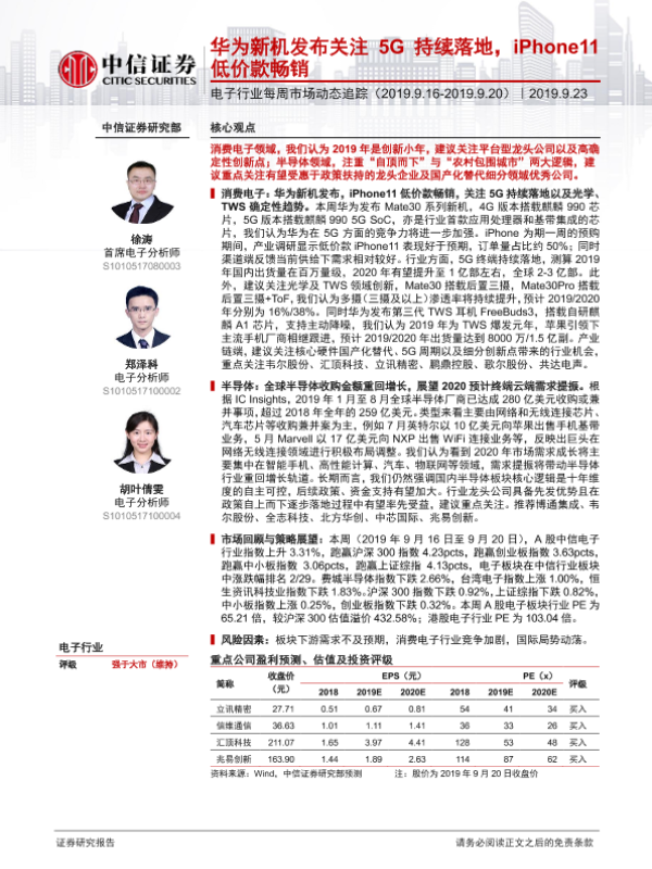 【安信证券】【20190916】电子元器件行业周报:iPhone11和Mate30相继发布,5G加持,消费电子持续引领市场关注-11页 行业研究