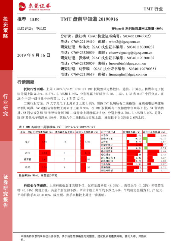 【东莞证券】【20190916】TMT盘前早知道:iPhone11系列预售量同比暴增480%-5页 行业研究