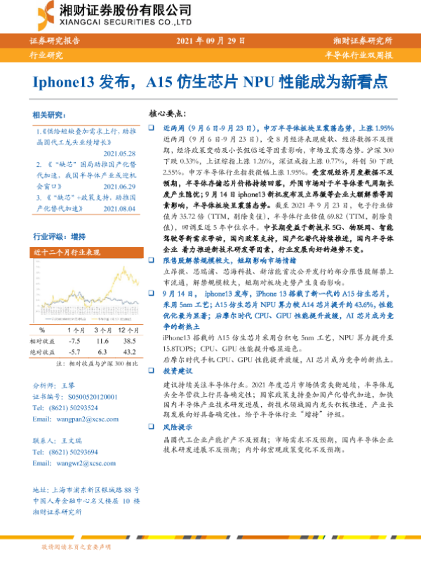 【湘财证券】【20210929】20210929-湘财证券-半导体行业双周报:Iphone13发布,A15仿生芯片NPU性能成为新看点-11页 行业研究