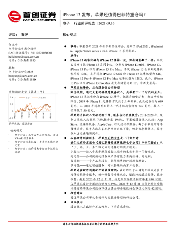 【首创证券】【20210916】20210916-首创证券-电子行业简评报告:iPhone13发布,苹果还值得巴菲特重仓吗?-6页 行业研究
