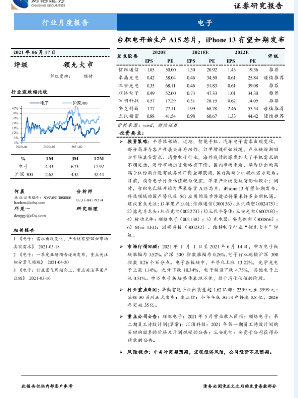 【财信证券】【20210617】电子行业月度报告:台积电开始生产A15芯片,iPhone13有望如期发布-11页 行业研究