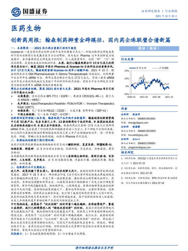 【国盛证券】【20211024】创新药周报:翰森制药掷重金辟蹊径,国内药企珠联璧合谱新篇-24页 行业研究