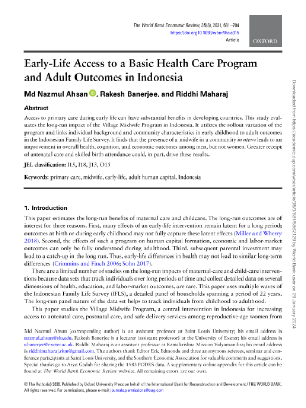 【The World Bank】【2021】Early-Life Access to a Basic Health Care Program and Adult Outcomes in Indonesia-24页 学术论文