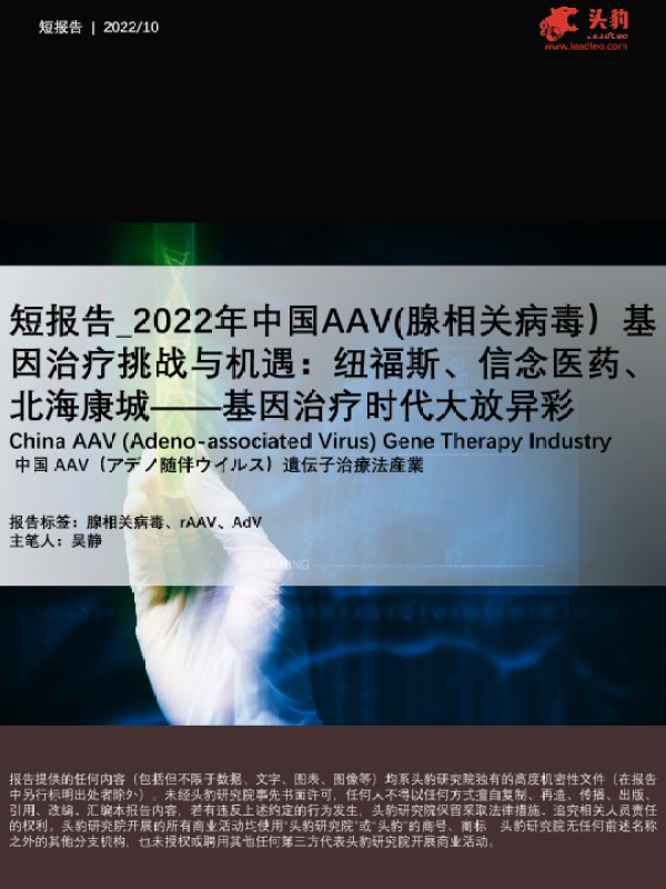 【头豹研究院】【20221001】2022年中国AAV(腺相关病毒)基因治疗挑战与机遇:纽福斯、信念医药、北海康城——基因治疗时代大放异彩-24页 行业研究